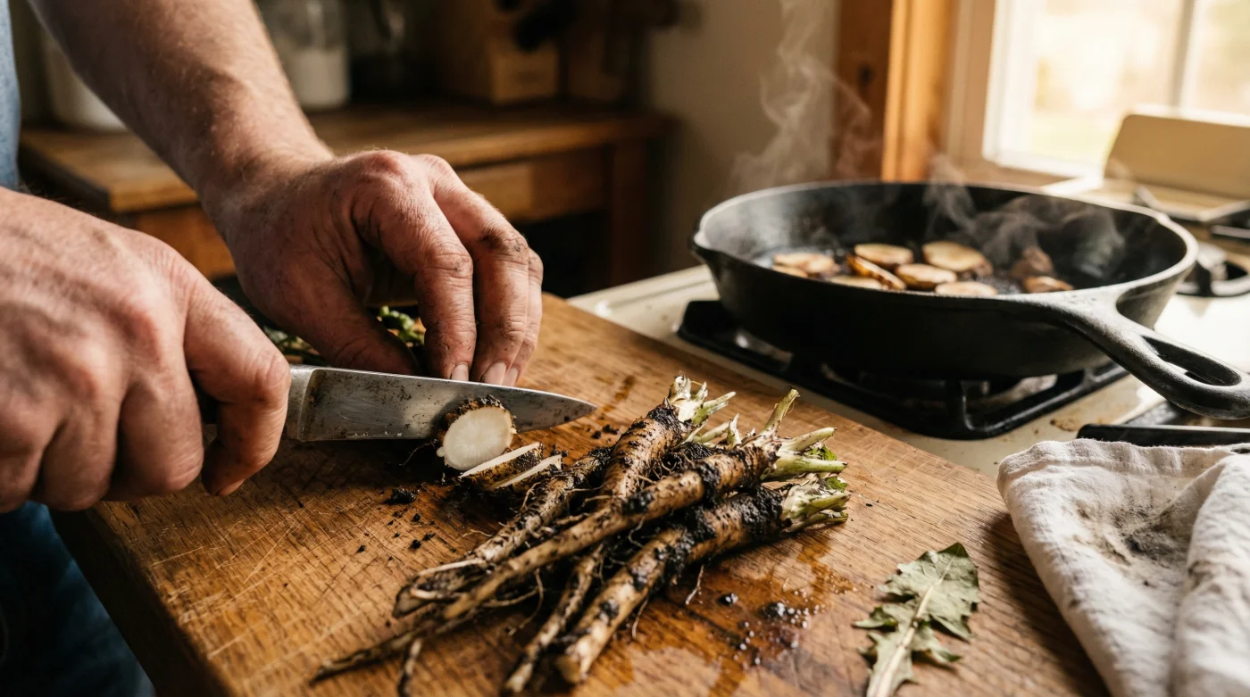 • The Dig: Use a long-handled weeding fork. You want the entire taproot, which can go deep. Spring roots are sweeter due to the stored inulin; autumn roots are more bitter.